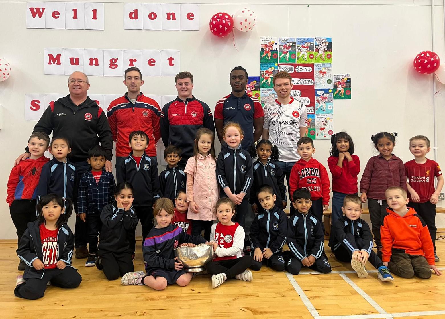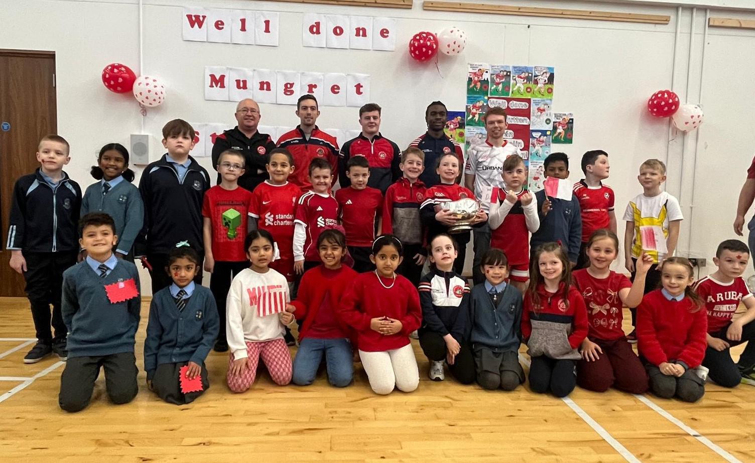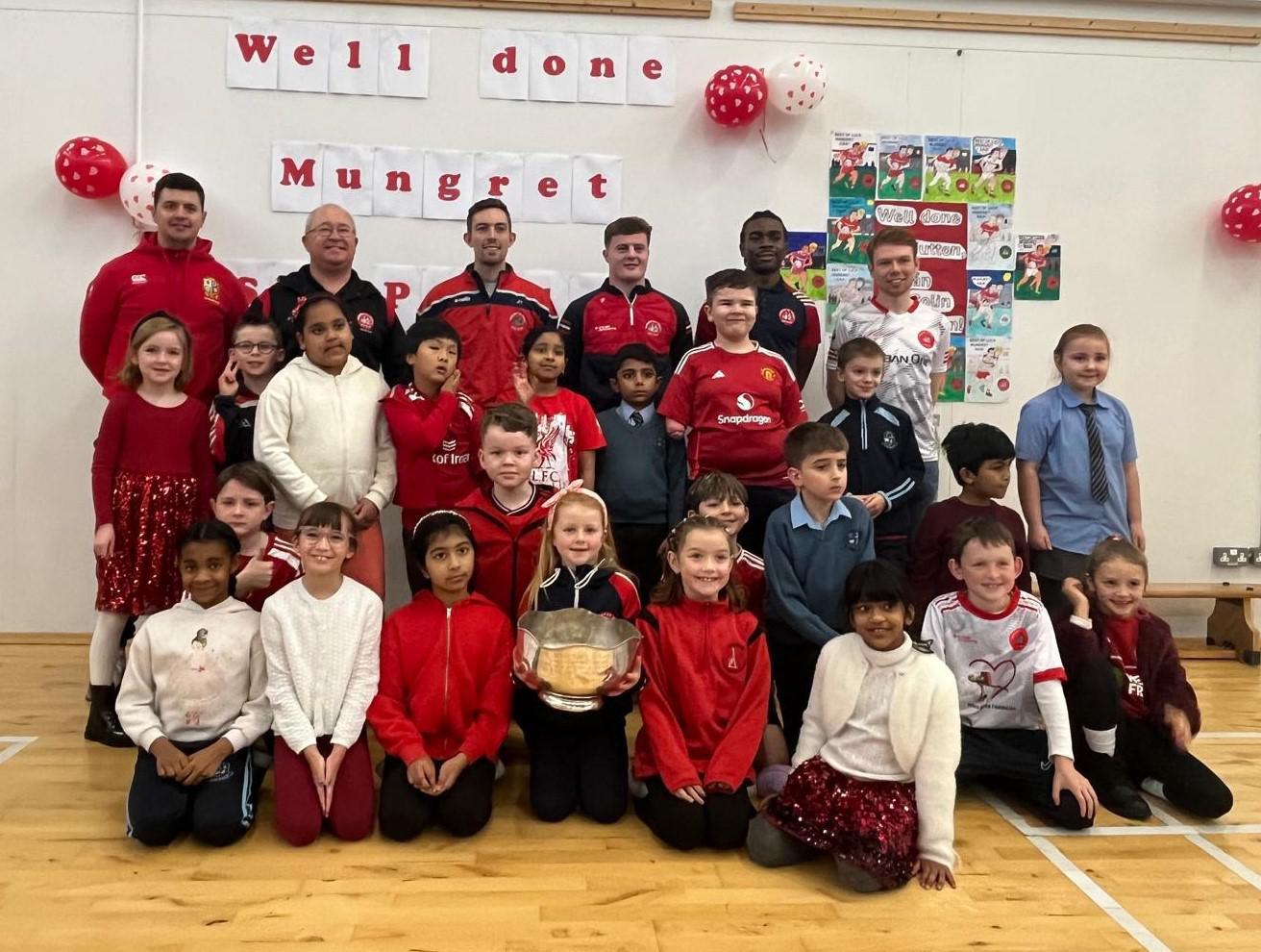 Students and staff gathered in the hall to celebrate the trophy’s arrival. The atmosphere was filled with cheers and applause as Mr. Hutton proudly held up the up. Each class had the opportunity to have their photograph taken with the team members and the cup, marking a proud moment for the entire school community.