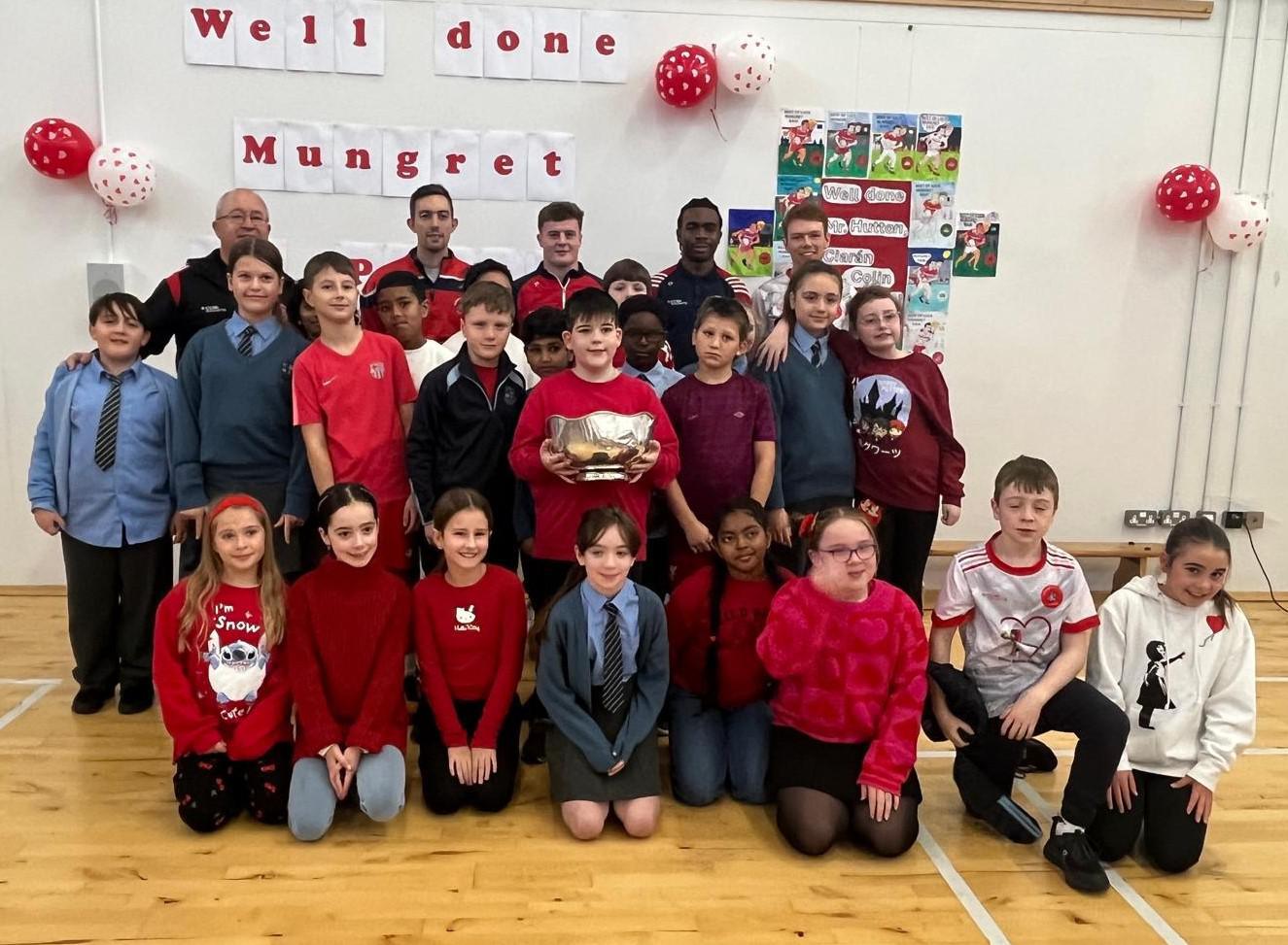 There was great excitement in our school on Wednesday, Nov. 12th when our teacher, Mr. Hutton, Captain of the Mungret/St. Paul’s Senior Football Team, arrived carrying the cup from the Final of the Football Championship on Sunday, November 9th. He was joined by team members Colin Rochford, Ciarán Uwatse and Jason Hasset who are also past pupils of our school including Team Manager, Kevin O’Hagan.